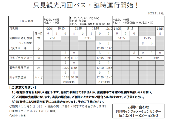JR只見駅到着の列車に合わせて、只見駅前から駅近隣観光施設間を周回するマイクロバスを11月3日(祝)より運行いたします。