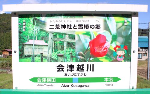 会津越川駅の新しい駅名標です。駅愛称は「二荒神社と雪椿の郷」です。