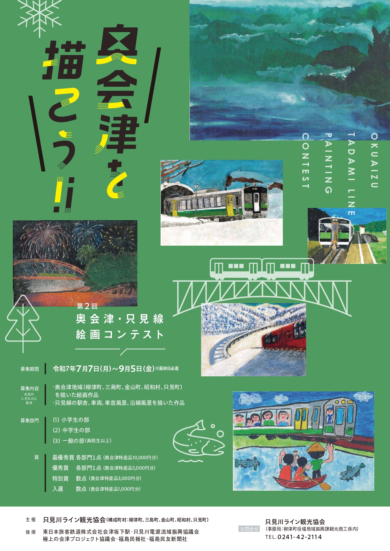 The Tadami River Line Tourism Association (Yanaizu Town, Mishima Town, Kanayama Town, Showa Village, Tadami Town) will hold the "2nd Oku-Aizu Tadami Line Painting Contest" to increase interest in Oku-Aizu and the Tadami Line and promote its appeal. Why not paint the beautiful scenery of Oku-Aizu and the Tadami Line? We look forward to receiving many entries!