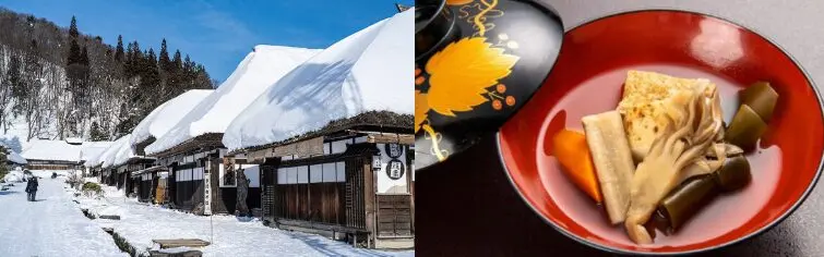 夕食は昆布・舞茸・ごぼう等を入れた只見のお祝いのお椀料理「お平(おひら)」など郷土料理が付いた会席料理をご用意。昼食にはご当地グルメ「柳津ソースかつ丼」と大内宿の名物、ねぎ1本で食べる「ねぎそば」をお楽しみください。