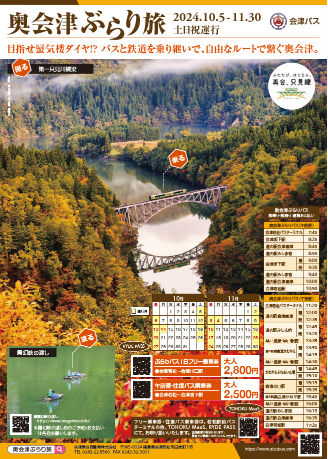 会津乗合自動車株式会社 0242-22-5560(9:00~17:00)https://www.aizubus.com/sightseeing/bus/okuaizu_burari