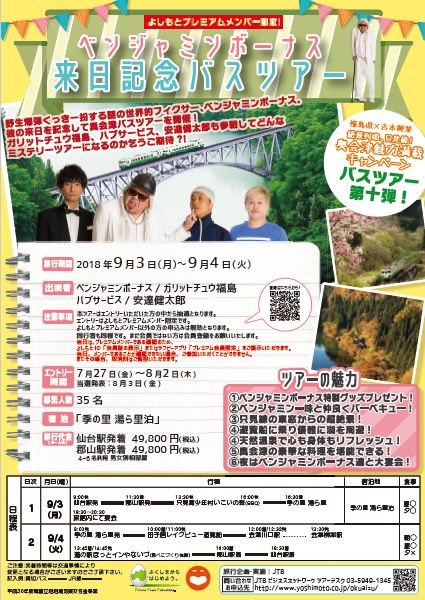 野性爆弾くっきー扮するベンジャミン・ボーナスのツアーを開催します。