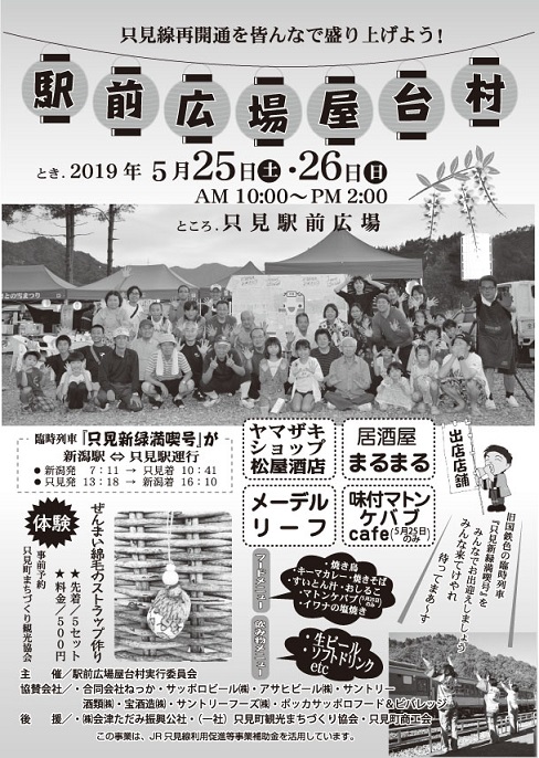只見駅前広場にて屋台村を開催します。臨時列車「只見新緑満喫号」が新潟駅より乗り入れますので、みんなでお迎えしましょう。