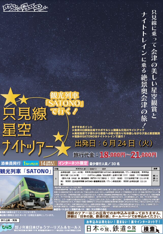 14:40会津若松駅発・只見線乗車🚋(観光列車SATONO)=16:34会津川口駅着、カボマルシェ開催・自由見学=🚍バス送迎=美坂高原にて野外夕食(弁当)後、星空観測(専門ガイドにて案内あり)=🚍バス送迎=21:05会津宮下駅発・只見線乗車🚋(観光列車SATONO)=22: 20会津若松駅着