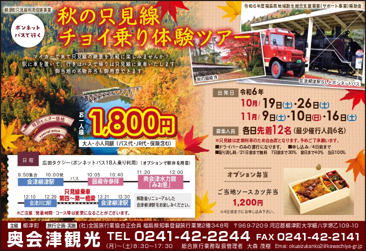 報名・洽詢:奧會津觀光 TEL 0241-42-2244 FAX 0241-42-2141 受理時間 週一至週六 8:30~17:30